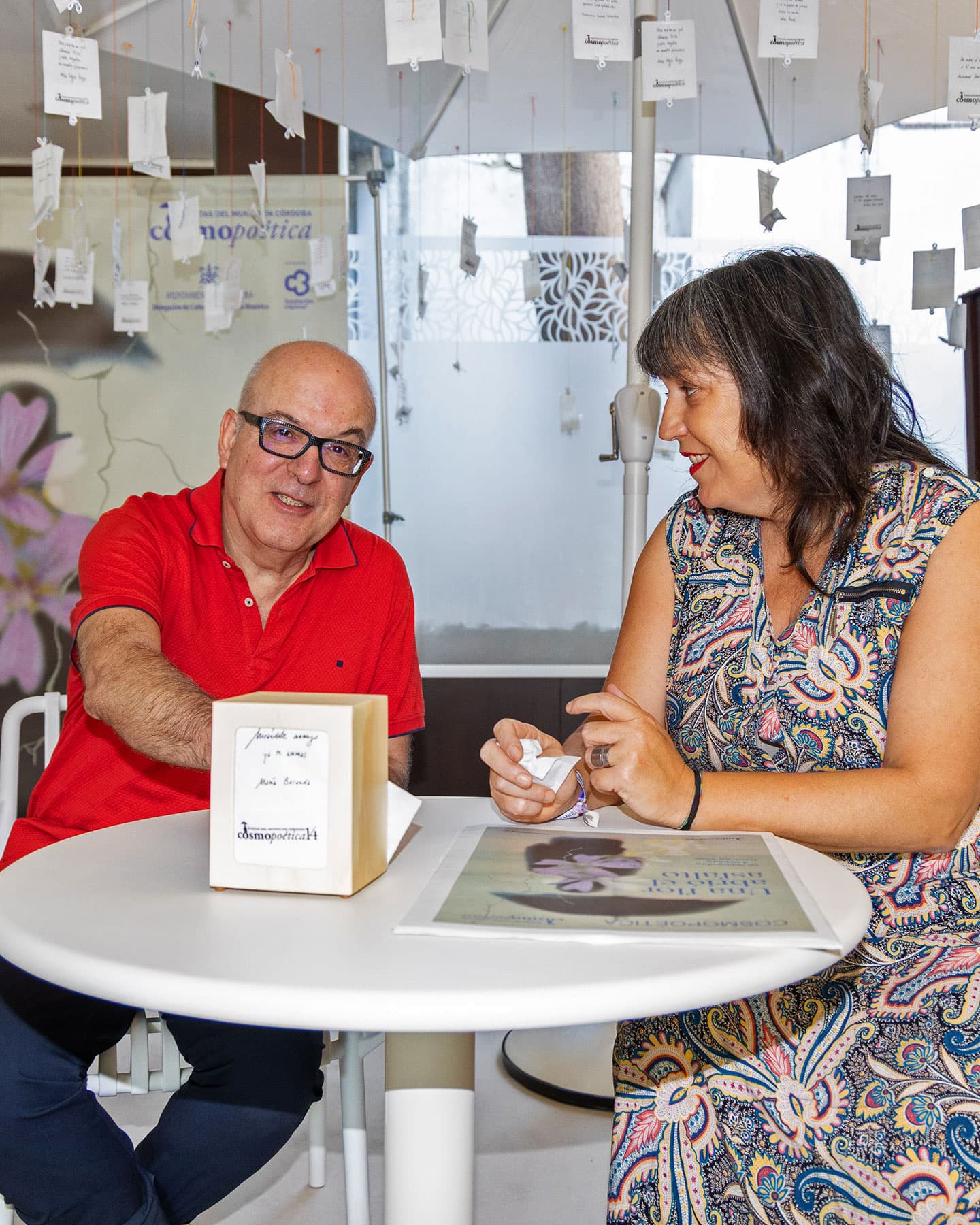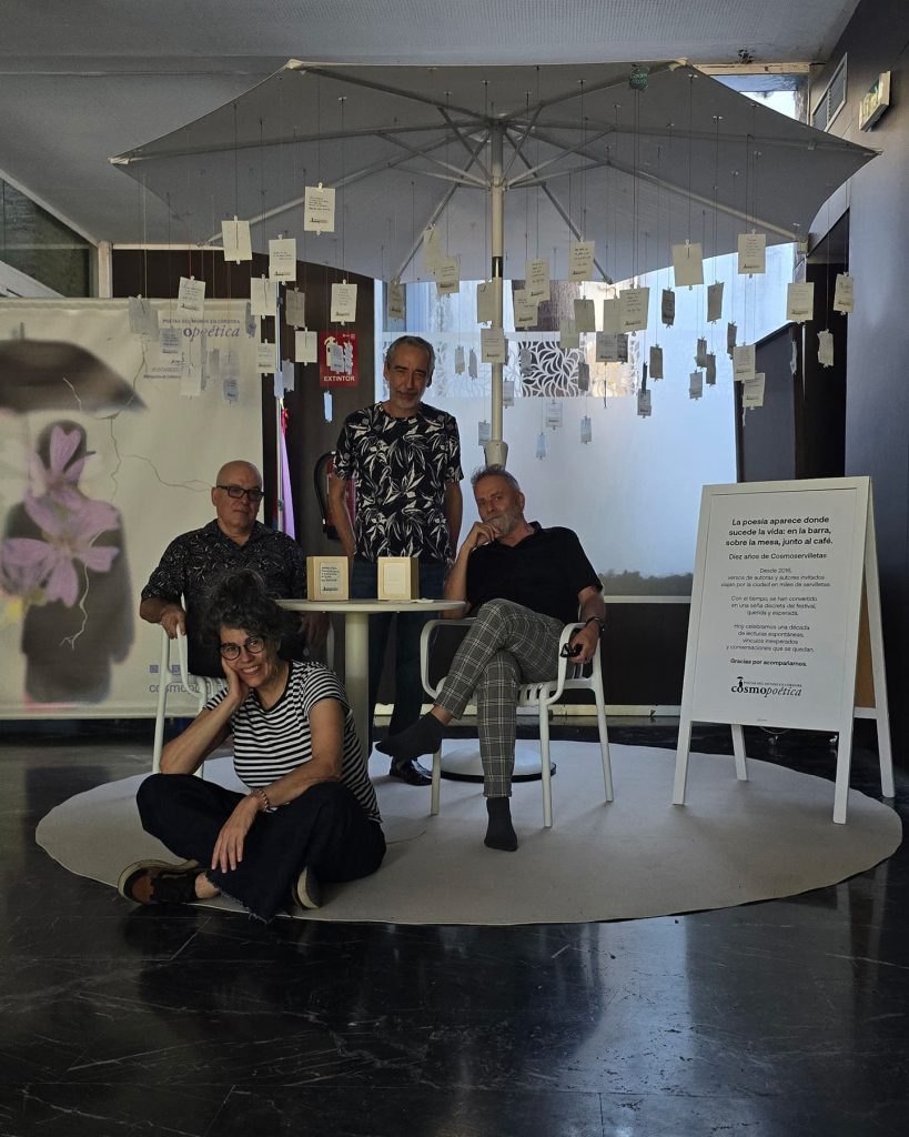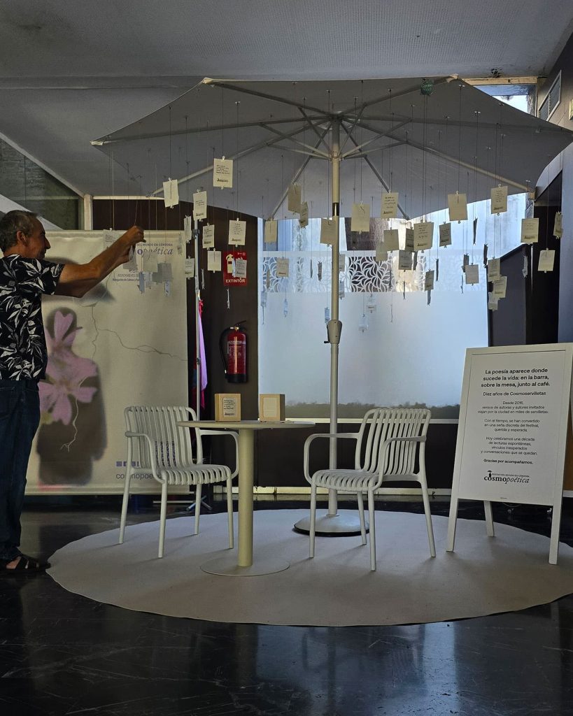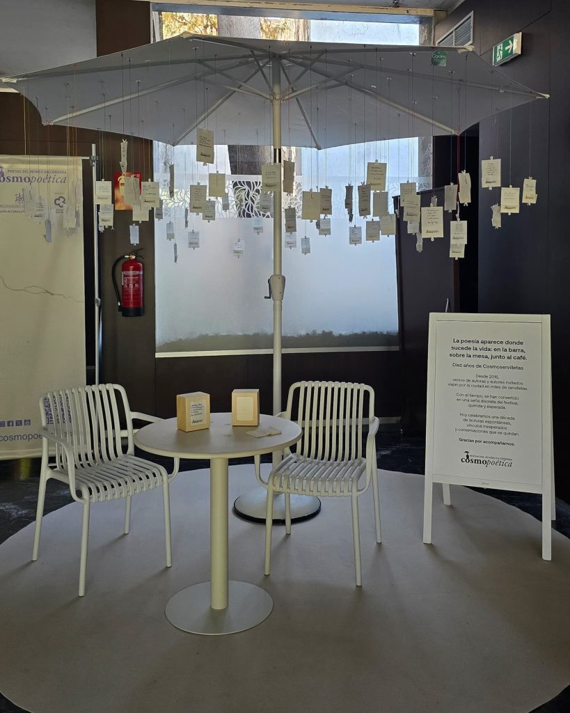 Desde 2016, versos de autoras y autores invitados han viajado por la ciudad impresos en miles de servilletas. Con el tiempo, Cosmoservilletas se ha convertido en una seña discreta del festival, querida y muy esperada, capaz de provocar lecturas espontáneas y conversaciones que perduran.