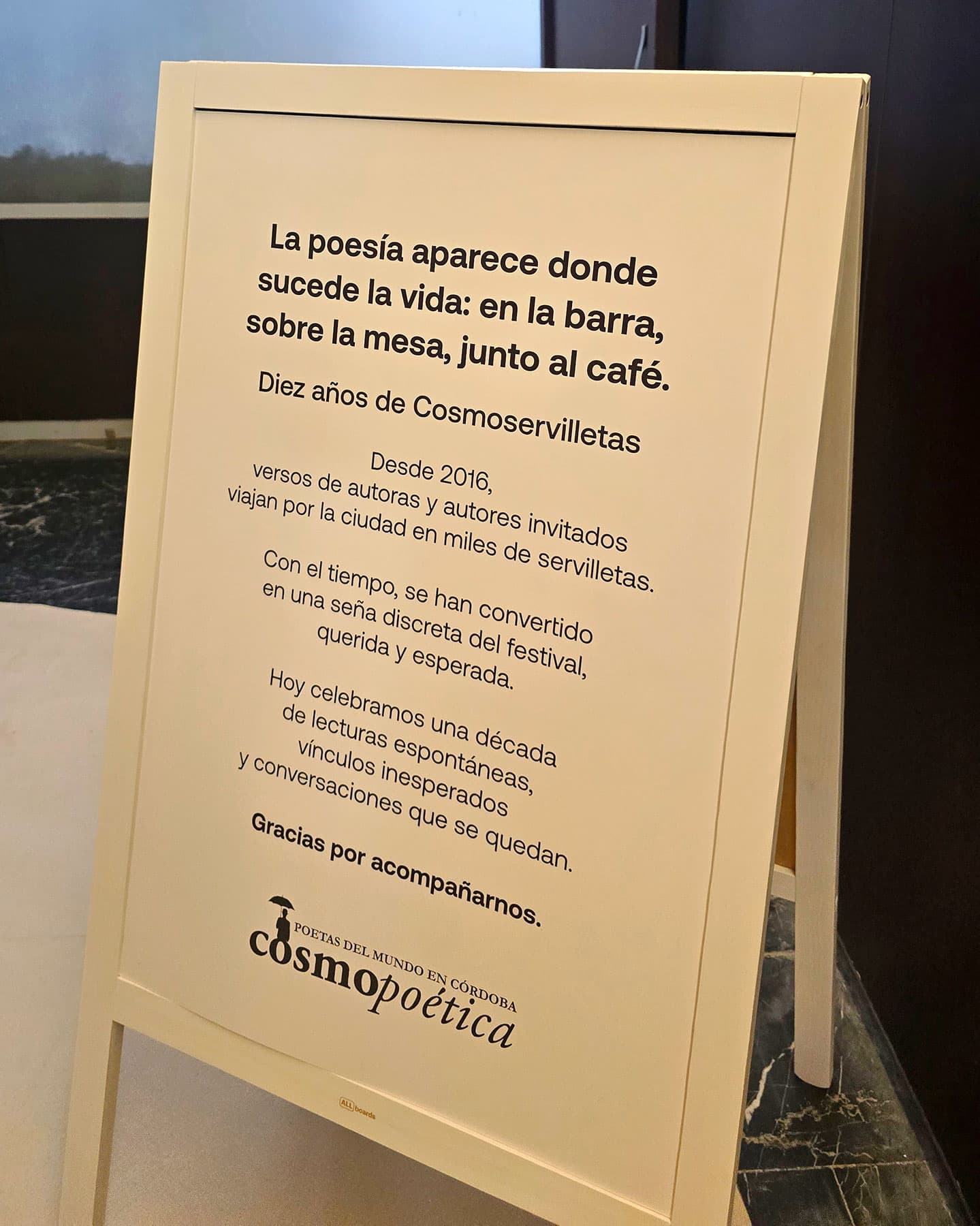 En 2025 quisimos celebrar esa trayectoria con un pequeño homenaje: un paraguas de servilletas, una mesa y un café para leer, firmar y guardar. Un gesto sencillo para recordar que la poesía también aparece donde sucede la vida: en la barra, sobre la mesa, junto al café.