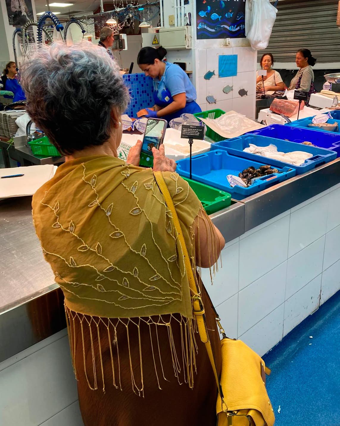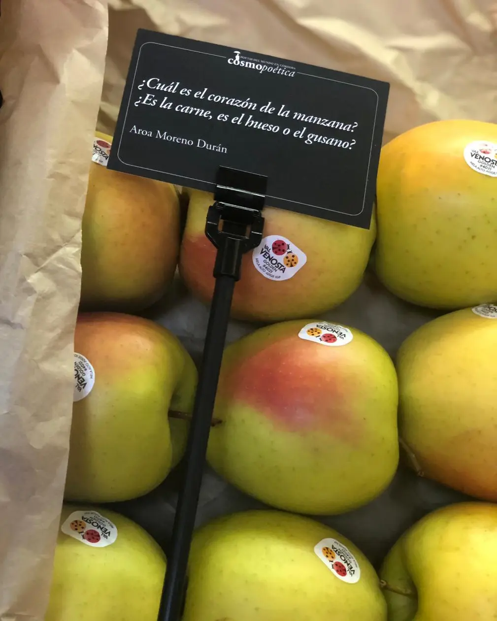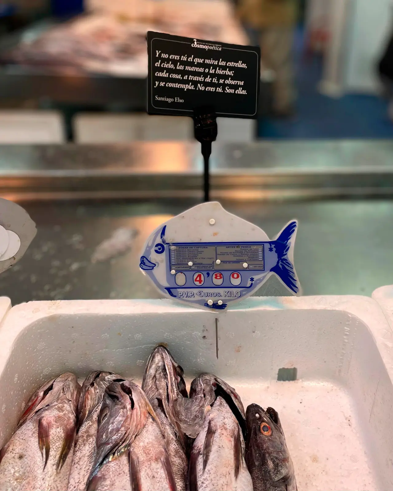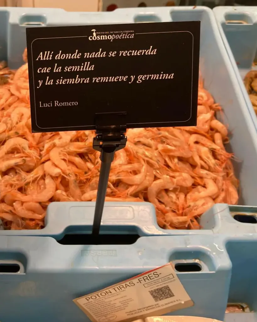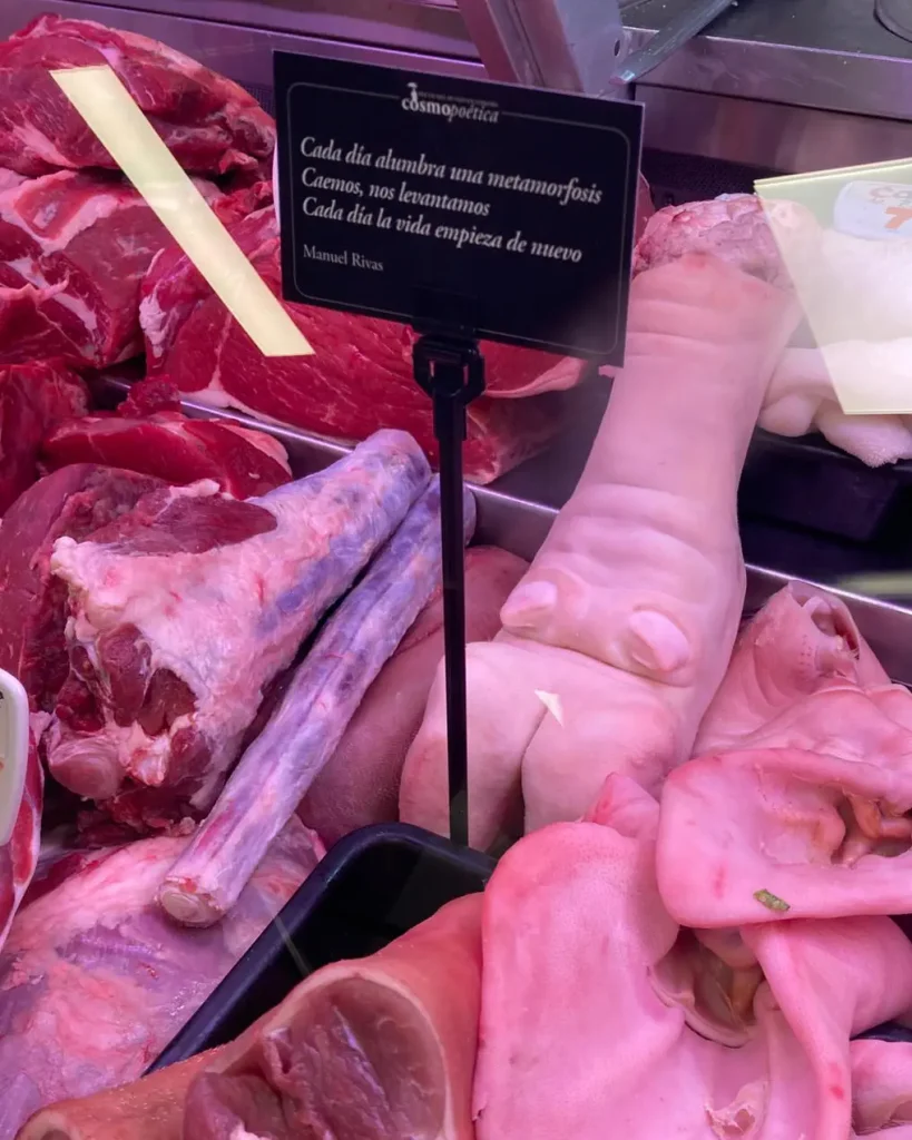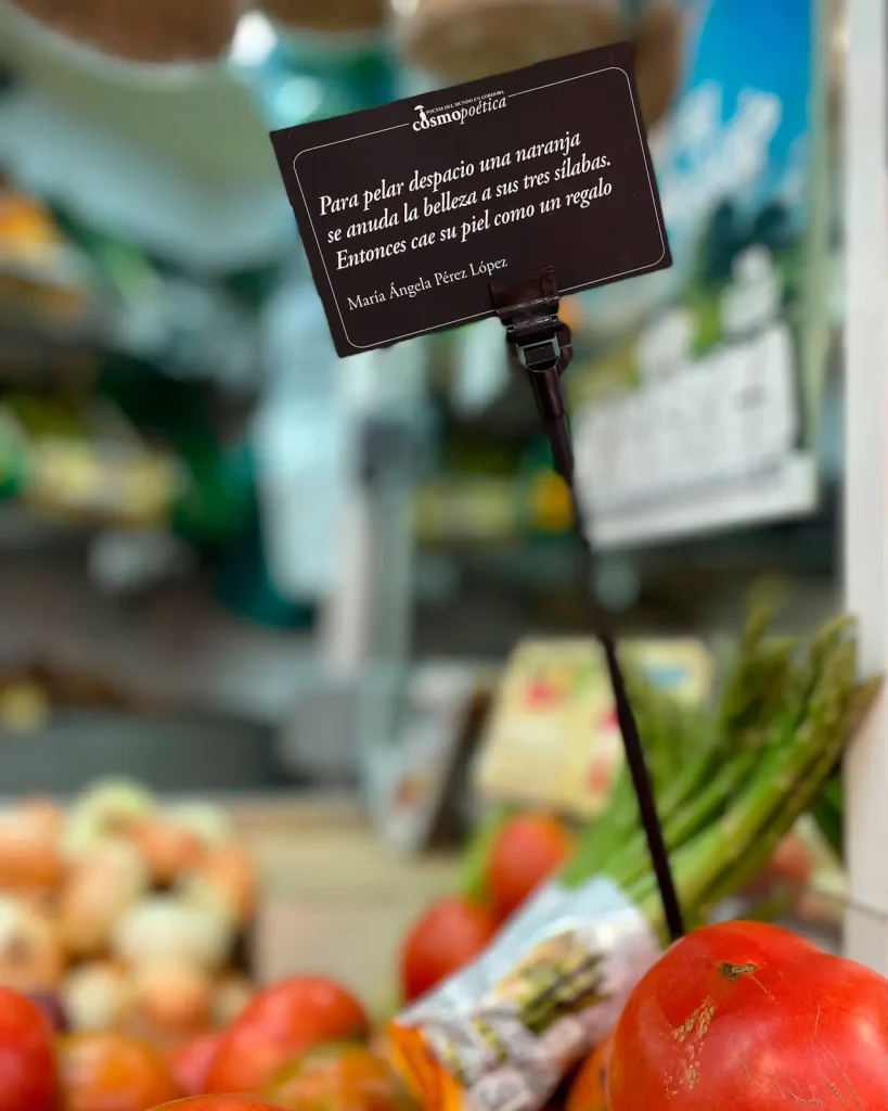 La acción se completó con pequeñas cartelas de mostrador, colocadas junto a frutas, verduras, pescado o carne, para que los poemas aparecieran en medio de la actividad cotidiana.