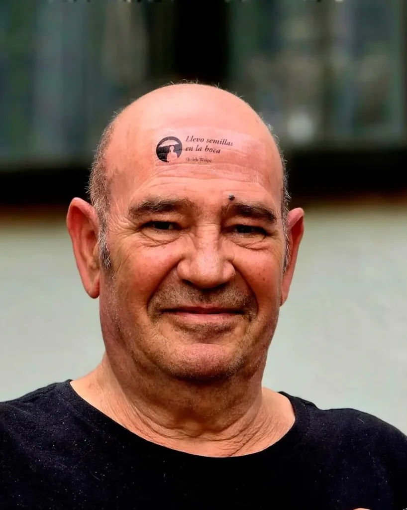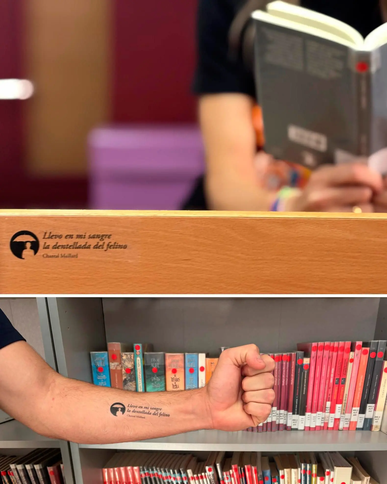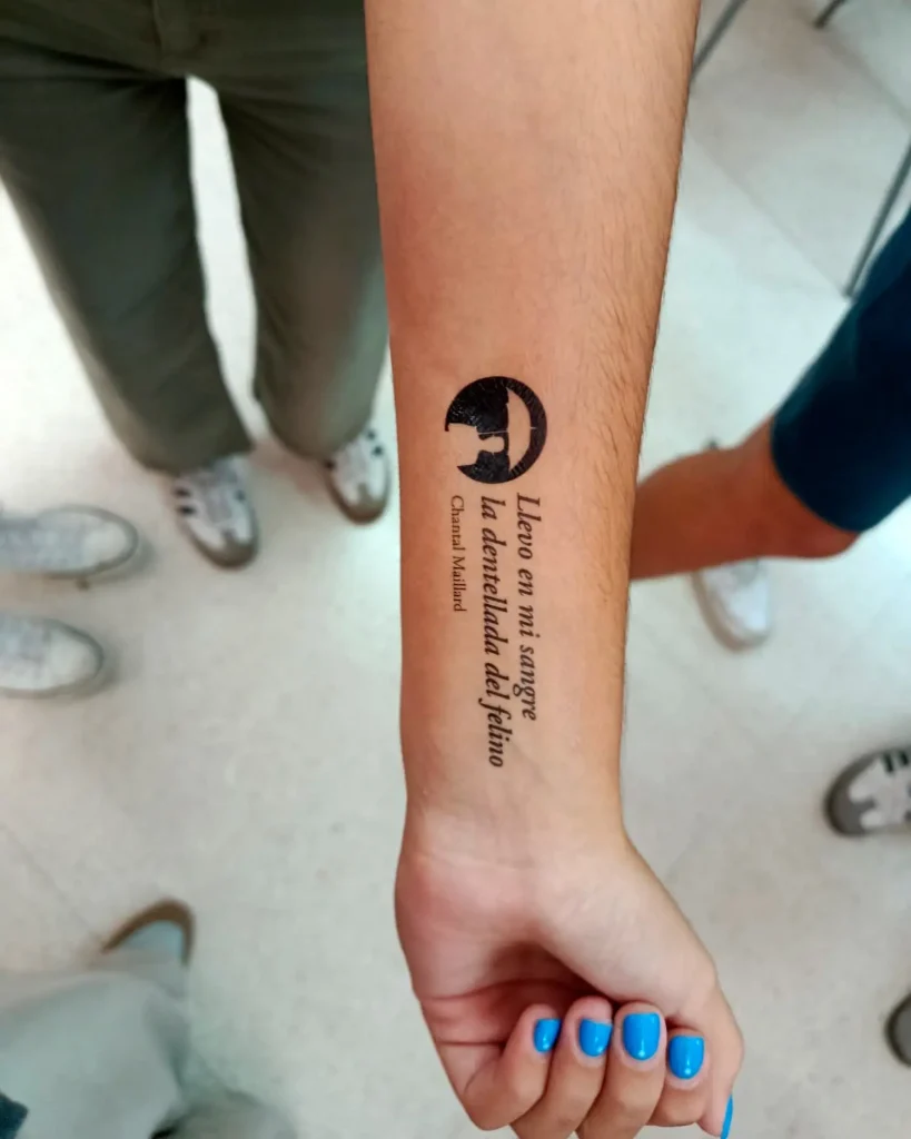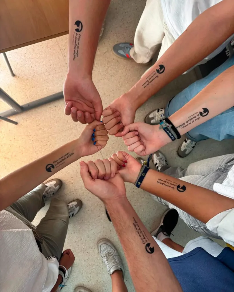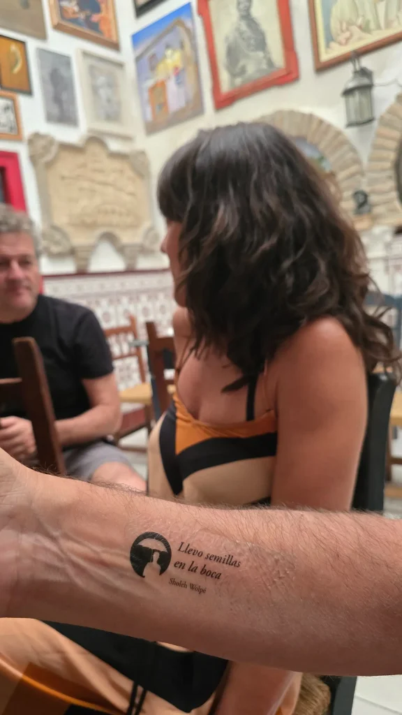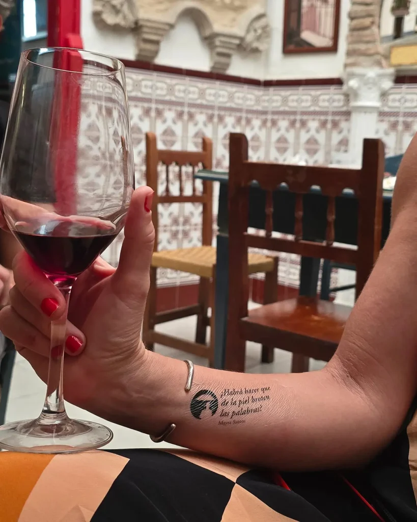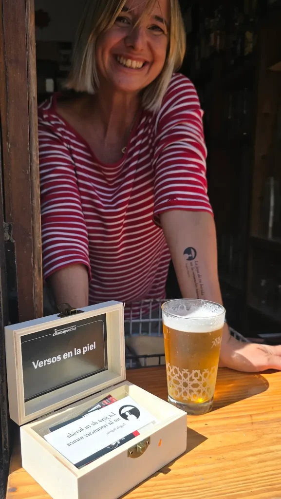 En «Versos en la piel» trasladamos la poesía al cuerpo. Seleccionamos versos de poetas asistentes al festival y los convertimos en calcomanías para repartirlas por institutos, bares y bibliotecas. La propuesta era sencilla: que las palabras brotaran literalmente a flor de piel y acompañaran a quien quisiera llevarlas consigo.